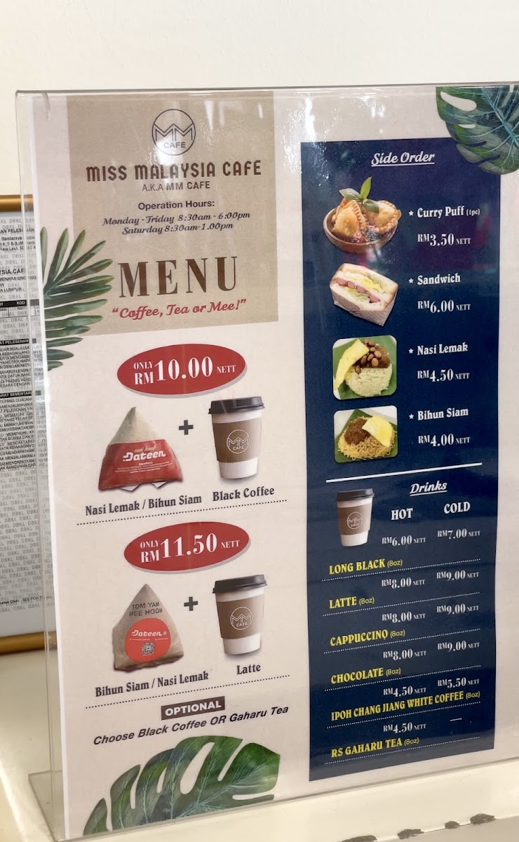 The menu at Miss Malaysia Cafe offers a selection of local Malaysian food and beverages suitable for breakfast, coffee breaks, and light meals. Visitors can expect a variety of food options including traditional dishes and light snacks alongside a range of hot and cold drinks.